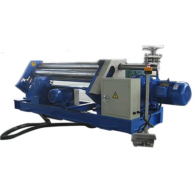 该机结构型式为三辊非对称式,上辊在两下辊中央对称位置作垂直升降运动,通过丝杆丝母蜗杆传动而获得,两下辊作旋转运动,通过减速机的输出齿轮与下辊齿轮啮合,为卷制板材提供扭矩。