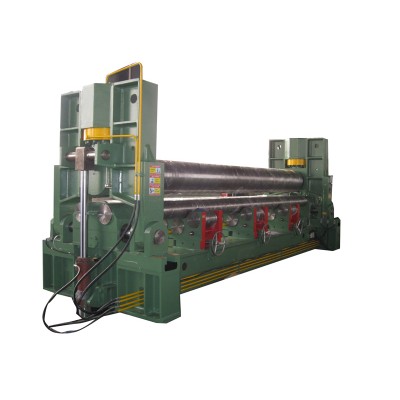 该机上辊可以垂直升降又可以水平移动,垂直升降为液压传动,通过液压缸内的液压油作用活塞杆而获得水平移动通过涡轮蜗杆箱、涡轮蜗杆、丝杆丝母机构传递扭矩,带动上辊的水平移动,下辊只作旋转运动为卷板提供扭矩,下辊下部设有托辊并可调节,上辊呈鼓形状,提高制品的直线度。适用于挂车各种截面形状罐体的卷制。