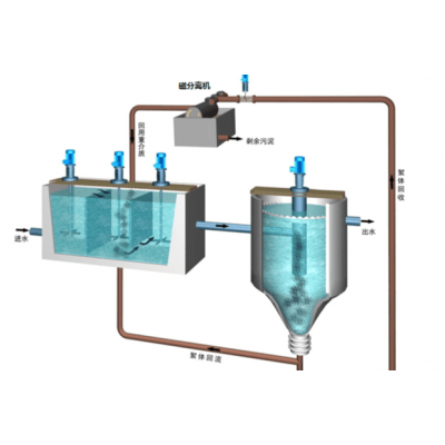 磁介质混凝沉淀采用一种极速混凝沉淀技术,通过投加磁介质粉为絮凝核,加速高浓度和大密度絮体的形成,起到压载或加重作用以加速沉淀过程,大幅提高絮体的沉降速度,提高去除效果和单位水池的效率;是新一代沉淀澄清技术、除磷技术和深度处理新技术,具有超快的沉淀速度、优良的沉淀效果和除磷效果。