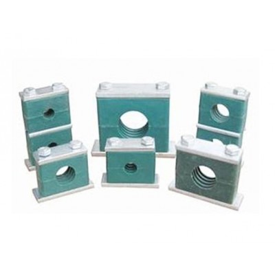 1、HZJ系列管夹具有抗振动、抗冲击、夹持力强度高、重量轻、耐腐蚀等特点。管夹主体材料采用高牌号球墨铸铁精铸而成;夹持面衬垫胶圈(板)材料根据工作温度确-定:工作温度小于或等于100℃时,采用普通橡胶;工作温度大于100℃小于150℃时,采用丁氰橡胶,工作温度大于150℃小于250℃时,采用氟橡胶制造。底板材料采用整体钢板制造,确-保了底板与管夹、底板与基面(支架)或机体的连接强度。管夹与底板连接采用两只螺栓(螺柱)紧固,便于维修或保养时的拆装。