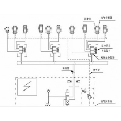 油气供应站设有一根供油主管和一根供气主管,所-有双线式油分配器的进油口和单线递进分配式油气分配混合器的进气口分别并接在供油主管和供气主管上。在系统工作时,供气主管内压缩空气常通,站上的高压油泵按设定的周期定时向系统的二条供油主管交替供油,双线油分配器定量分配送出的油再分送到各个单线递进分配式油气混合器进行若干份的油再分配,并在出口处与压缩空气混合,在压缩空气的作用下通过输送管路送至各润滑点。